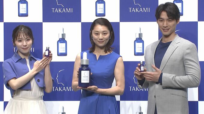 俳優・小池栄子さん、福士蒼汰さん、松岡茉優さんが、スキンケアブランド「タカミスキンピール」20周年記念CM披露会見に登壇。スキンケアについてトークセッションを行いました。