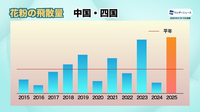 特に瀬戸内地域では前年の飛散量が非常に少なくなったため、前年比で500%を上回り、800%を超える地域もある予想。