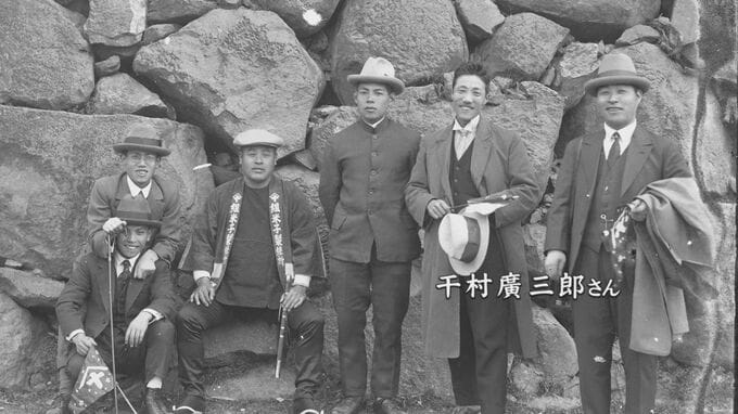 「こちらの写真に写っている右から2人目の男性、帽子を手に持ってにっこりとほほ笑んでいます。足の組み方もダンディな感じでありますけど、こちらが写真を撮影された干村廣三郎さんです。当時写真館は花形職業でもありますから、こういったモダンな雰囲気の方がたくさんおられたのではないかと思います。」