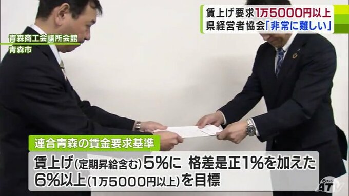 春闘が青森県内でも本格化します。県内最大の労働者団体「連合青森」が、経営者団体に賃上げを求めました。賃上げ目標は月額1万5000円以上で過去最高水準です。県経営者協会への労使交渉の申し入れでは、賃金の6%…