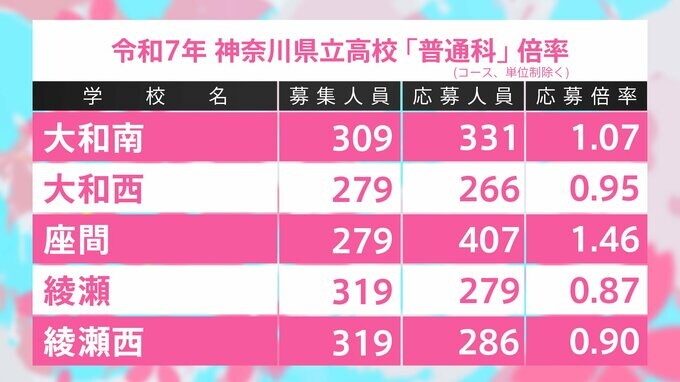神奈川県立高校入試2025 全日制普通科 志願倍率は横浜翠嵐2.22倍、新城2.05倍、多摩1.85倍に【令和7年度高校受験】 TBSテレビ 2025年1月30日(木) 20:02 国内 学校別の一覧 座間1.46倍、大和南1.07倍