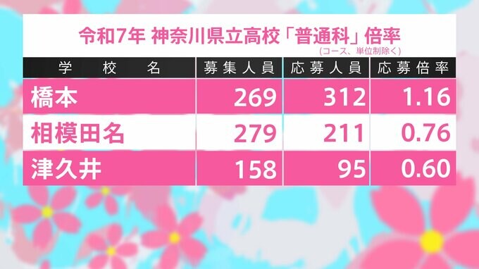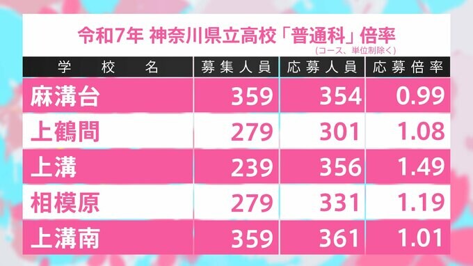 神奈川県立高校入試2025 全日制普通科 志願倍率は横浜翠嵐2.22倍、新城2.05倍、多摩1.85倍に【令和7年度高校受験】 TBSテレビ 2025年1月30日(木) 20:02 国内 学校別の一覧 上溝1.49倍、相模原1.19倍