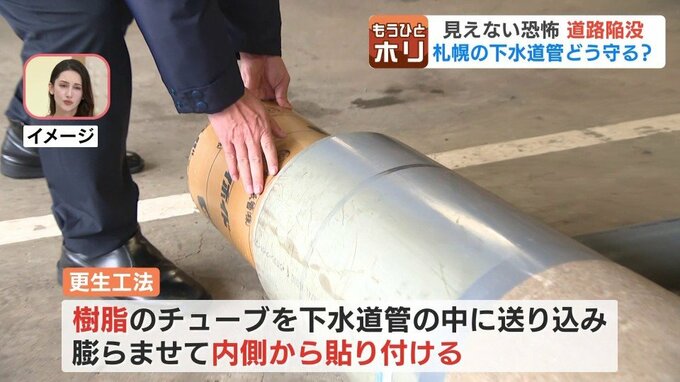 10年ほど前から増えているのが、樹脂でできたチューブを破損した下水道管の中に送り込み、空気圧などで膨らませて、内側から貼り付ける工法です。