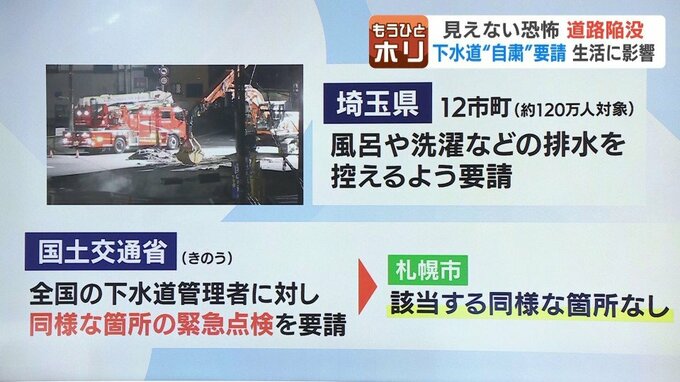 今回の埼玉の事故を受けて、埼玉県内12の市や町の約120万人を対象に、汚水が溢れる可能性があるとして、風呂や洗濯などの排水を控えるよう要請しています。