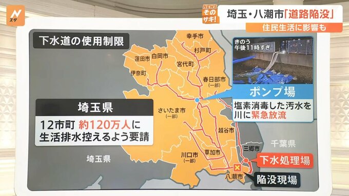 陥没現場から遠く離れた埼玉県北部の地域にも要請が伝えられています。それは今回の陥没現場が下水処理場の近くだからです。