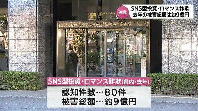 去年、宮崎県内で確認されたSNS型投資・ロマンス詐欺の被害総額は、およそ9億円にのぼったことが県警察本部のまとめで分かりました。SNSを使い投資などの名目で金銭をだまし取るSNS型投資詐欺や、メッセージのやり…