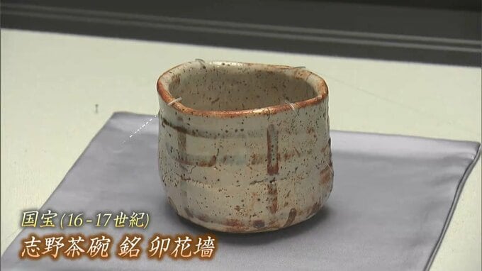 桃山時代に作られたこちらの茶碗は、歪みが加えられた躍動感あふれる形が特徴です。正円形が主流だった当時の陶芸文化に影響を与え、国宝に指定されています。