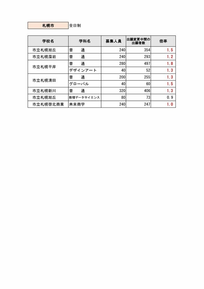 そのほか、札幌南は8人減で倍率1.3倍(当初1.4倍)、札幌北は6人減で倍率1.2倍(当初と変わらず)、札幌東は7人減で倍率は1.6倍(当初と変わらず)です。