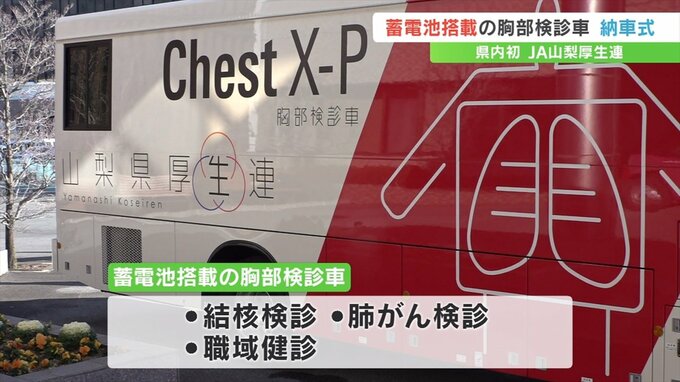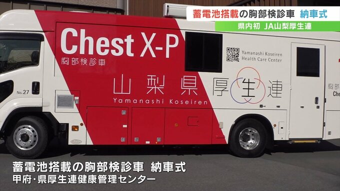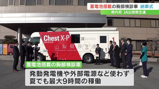 蓄電池を搭載した胸部検診車が山梨県内で初めて導入され、1月31日に甲府市で納車式が行われました。