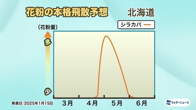 本格飛散は、道南や道央でゴールデンウイーク前後、道北や道東では、5月上旬~中旬で、5月下旬になると段々と飛散量は少なくなる見込みです。