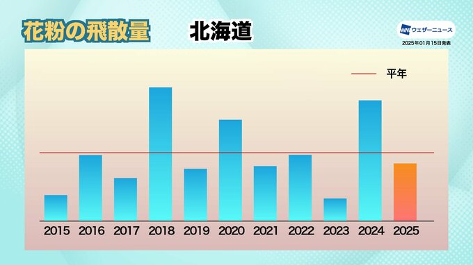 ウェザーニューズによりますと、花粉の飛散開始時期は道南や道央など早い所で4月中旬、そのほかのエリアで4月下旬から5月にかけての予想で、平年よりもやや早くなるとみています。