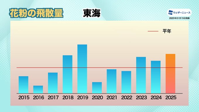 花粉の飛散開始時期は静岡県で1月下旬、その他のエリアで2月上旬から中旬の予想で、平年よりも早くなるとみています。