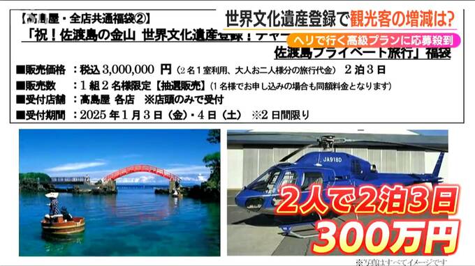 百貨店・高島屋と共同で売り出したこの旅行パックは、新潟市からヘリコプターで島に入り高級ホテルに宿泊するもので、なんとお値段は2泊3日で300万円!