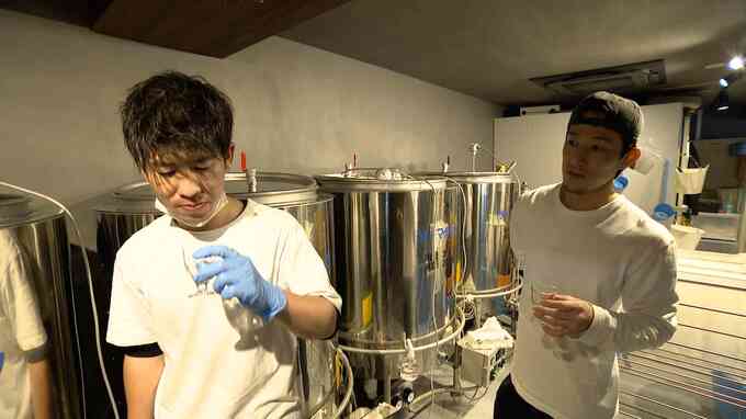 福岡市中央区のマンションの1階にバーを併設する醸造所がある。店の入口は木がふんだんに使われている。バーカウンターを抜けてさらに奥に進むと、そこには銀に輝く円柱状の容器が何本も並んでいた。その脇でTシャツ姿の若い男性2人が立っている。柳生光人さん(29)と穴見峻平さん(29)だ。石川県や新潟県などで修行を積んだ2人が試作品の感想を出し合っている。