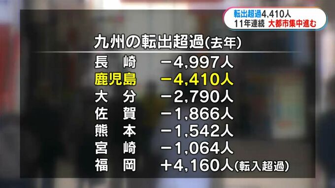 大都市への人口集中が進んでいます。鹿児島県の去年の人口は、転出が転入を上回る「転出超過」が4410人となり、前の年を上回りました。転出超過は、現在の統計方法となって11年連続です。総務省は31日、住民基本台…