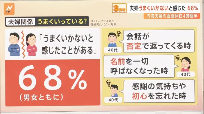 ただ、夫婦・パートナーといえど、うまくいくことばかりではありません。「夫婦関係はうまくいっているか?」というアンケートに「うまくいかないと感じたことがある」と答えた人は男女ともに68%でした。(はぐくみプラス調べ 既婚男女400人対象)