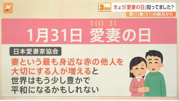 1月31日は「愛妻の日」です。1月の1をローマ字の「I」に見立てて愛妻の日となっているようです。