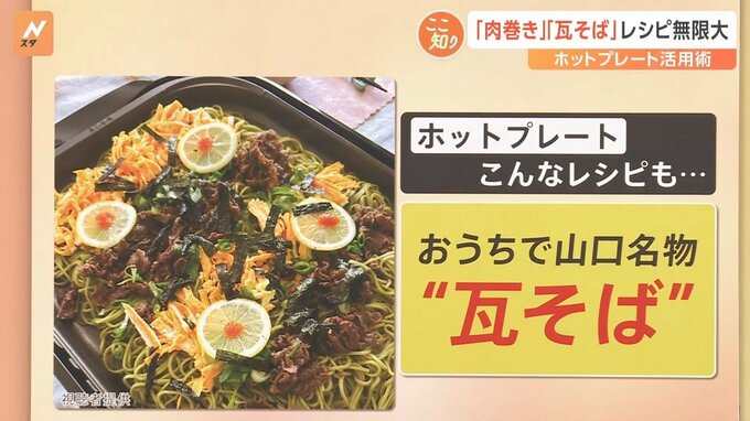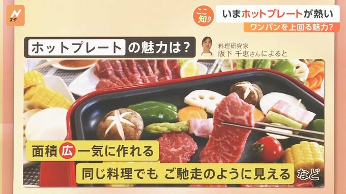 料理研究家の阪下千恵さんは、ホットプレートの魅力について「面積が広いので一気に作れる。同じ料理でもご馳走のように見える」などフライパンではなく、ホットプレートの方が映える一面もあると話します。