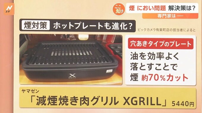 穴あきタイプのプレートになっていて、油を効率よく落とすことで煙を約70%カット。さらに上位機種だと、煙も吸い込んでくれるということです。(ビックカメラ有楽町店の担当者によると)