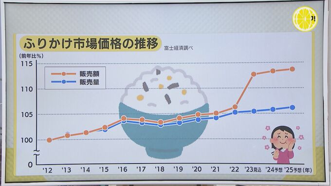マーケット調査会社・富士経済の調べによると、国内のふりかけ業界の販売量と販売額について前の年との比較したデータを見ると年々伸びていることがわかります。物価高の中で、家計を支える救世主にもなるのでしょうか?100年以上にわたって「ふりかけ」を手がける広島の老舗メーカーを取材しました。
