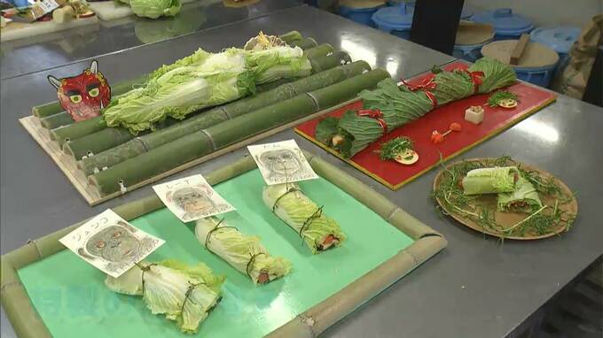 モルモットが美味しそうに食べているのはリンゴやバナナなどを白菜にくるんだ特製の恵方巻きです。動物たちに福が訪れるようにと、池田動物園の飼育員が毎年手作りしてプレゼントしているものです。
