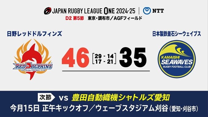 ラグビーリーグワンD2の日本製鉄釜石シーウェイブスは1日、日野レッドドルフィンズと対戦し46対35で敗れました。