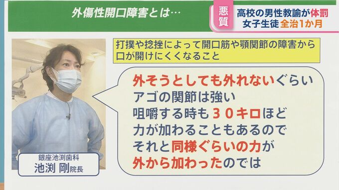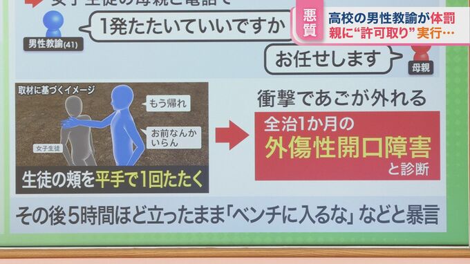 この平手打ちの衝撃でアゴが外れ、その後女子生徒は全治1か月の外傷性開口障害と診断されました。ただ、すぐに診察を受けたわけではありませんでした。
