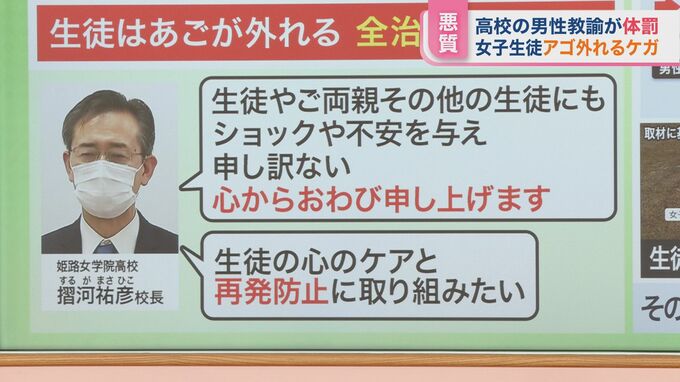 10月3日、体罰があったとして謝罪会見を行った兵庫県姫路市の姫路女学院高校。学校によると、ソフトボール部顧問の男性教諭(41)がユニフォームを忘れてきた1年生の女子生徒(16)に対し、平手打ちをしてアゴが外れる大けがをさせたということです。