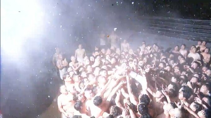 福を授かろうと、まわし姿の男たちが宝木(しんぎ)を奪い合う金山寺会陽が昨夜(1日)、岡山市北区で行われました。雪が舞う午後10時、宝木が投下されました。金山寺会陽は、約1300年前の創建以来伝わる伝統行事…