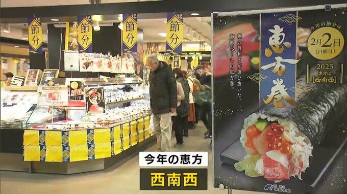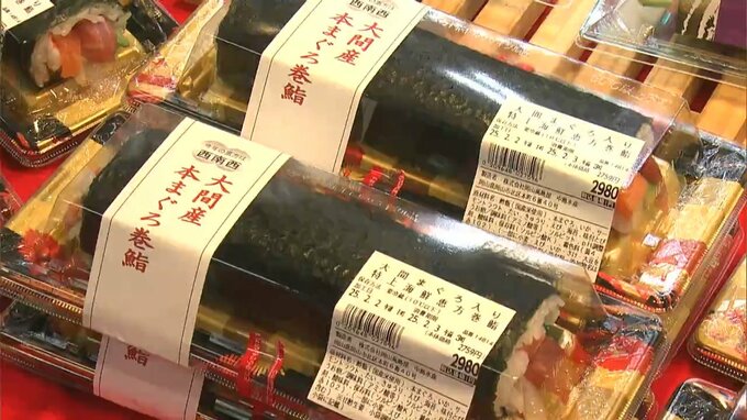 節分の日に食べる縁起物の「恵方巻」を集めたフェアが、岡山市北区の岡山高島屋で開催され、買い求める客でにぎわいました。