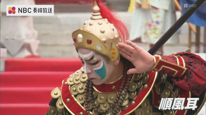 観客の邪気を払う「直庫(てっこ)」の演技や守護神の「千里眼(せんりがん)」「順風耳(じゅんぷうじ)」が演舞を披露し、その後、太鼓の音と共に長崎の街を練り歩きました。