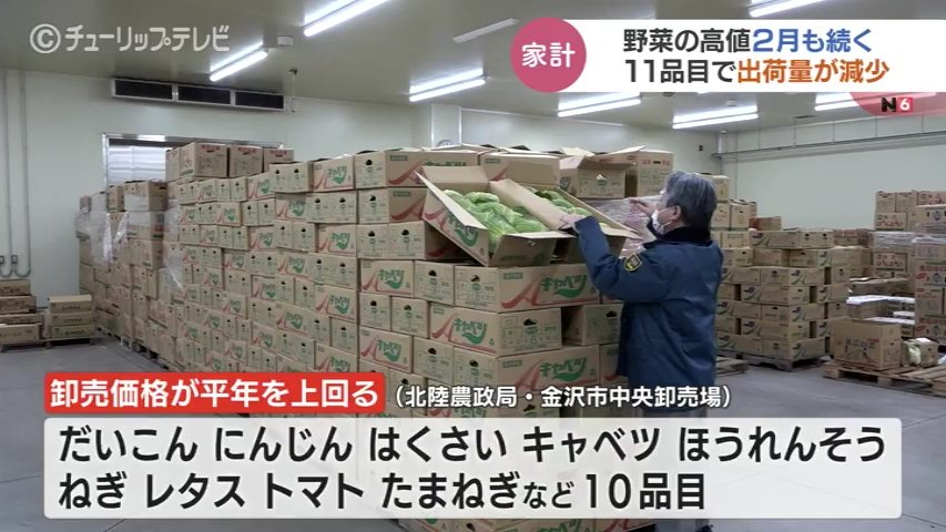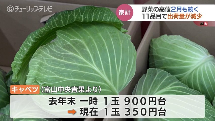 一方、富山中央青果によりますと年末から一時一玉900円台まで値上がりしていたキャベツは、先月中旬から一玉350円程度に安定し始めているということですが依然高値です。