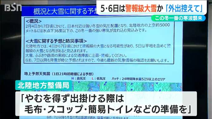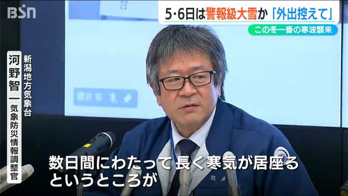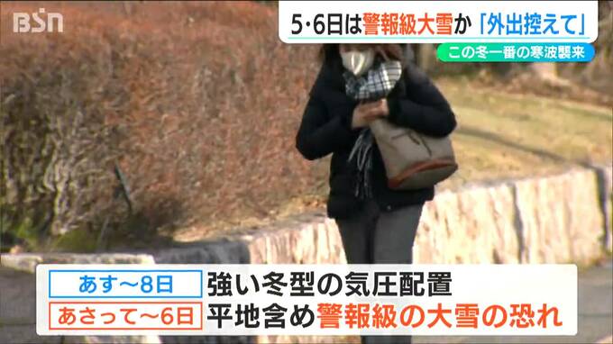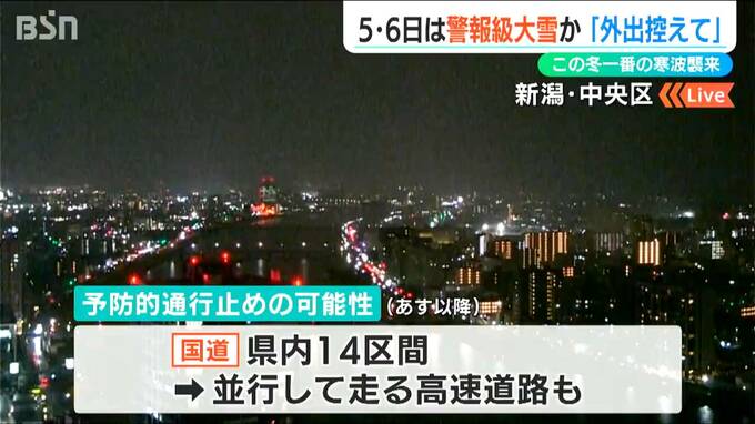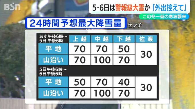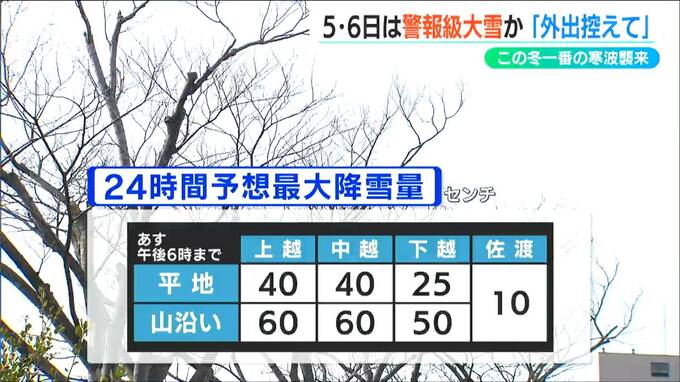 この冬一番の強い寒気がやってきます。最も心配なのは5日と6日。新潟県の下越の平野でも24時間で50センチの降雪が予想されていて、北陸地方整備局は不要不急の外出を控えるよう呼び掛けています。