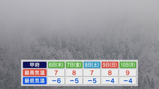 県内では今のところ雪に関する予報は出ていませんが、6日から10日にかけて甲府でもマイナス4度を下回る厳しい冷え込みとなり、日中の気温も上がらず寒い日が続く見込みです。