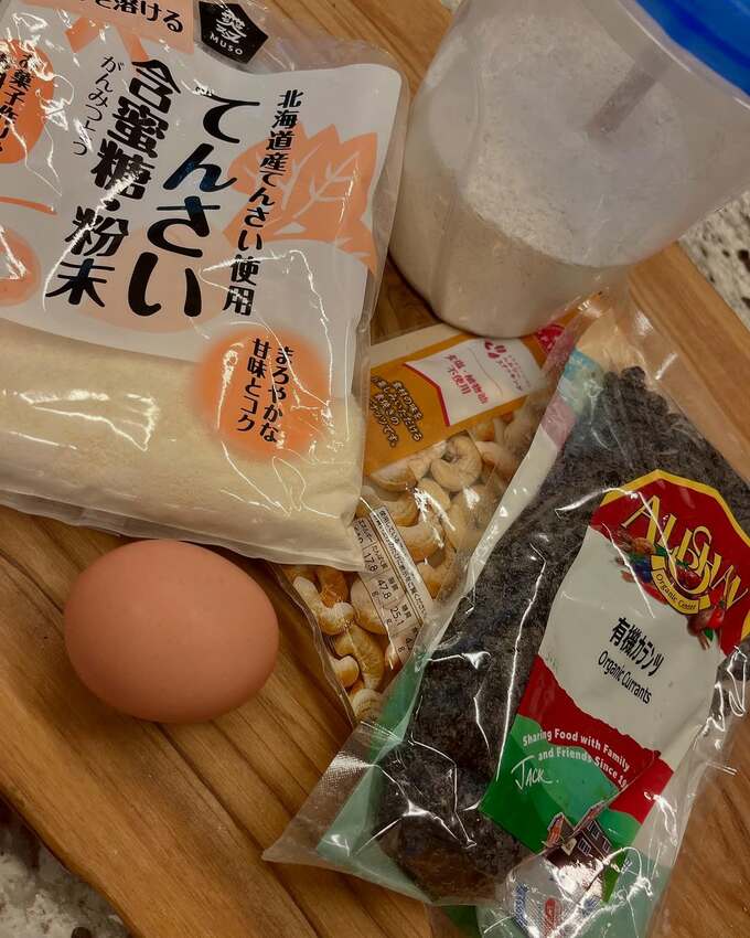 続けて「好きなドライフルーツやナッツ、チョコレート、いろいろ楽しく作れます!」「今日は作った陳皮をたっぷり入れたかったので、オレンジ風味のビスコッティです。」と綴ると「全粒粉強力粉 お米カップ山盛り 卵1つ てんさい糖 お米カップ半分弱 陳皮適量 カレンツ 本当はアーモンドを入れたかったのですが、なかったのでカシューナッツ!」と、材料について綴りました。