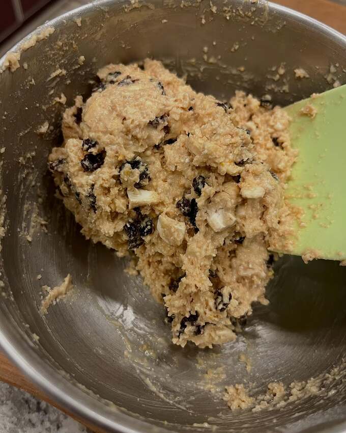 そして「先に卵とオリゴ糖を混ぜます。そして、次はこの子ですが、全粒粉で作ると、水分をとても含むため生地は硬くなります。薄力粉か、強力粉でも同じように、強力粉の方が硬くなります。今回私は全粒粉の強力だったので、生地をまとめる時は、両手にオリーブオイルをつけて形にしています。柔らかい場合は、クッキングペーパーにそのまま落として形を取ると良いと思います!」と、説明。