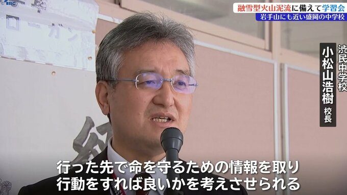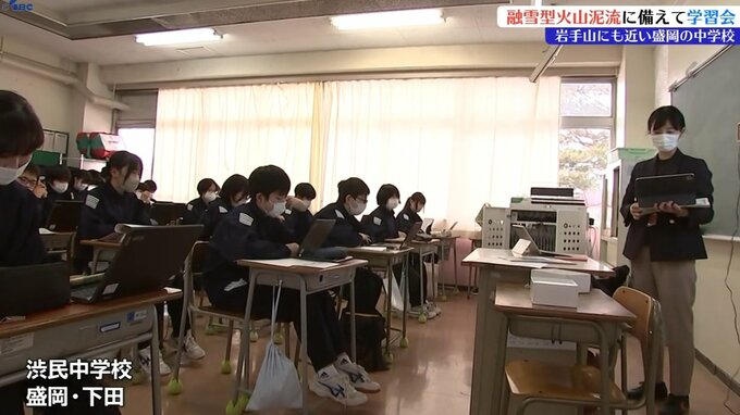 この時期に岩手山が噴火した際に発生する恐れのある融雪型火山泥流に備えて、生徒が避難経路を考える学習会が盛岡市の中学校で行われました。