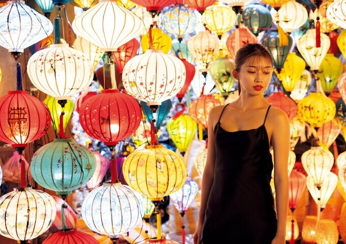 お気に入りのカットは、ランタンに囲まれて伏し目がちな表情を浮かべる1枚。“ベトナムの旧市街地で撮りました。夜の街で撮るのはあまりなかったのですごく貴重な経験だった。ベトナムの夜はランタンがたくさんあって色鮮やかだったので、自分の心もより鮮やかになったなと思います”と、にっこり。