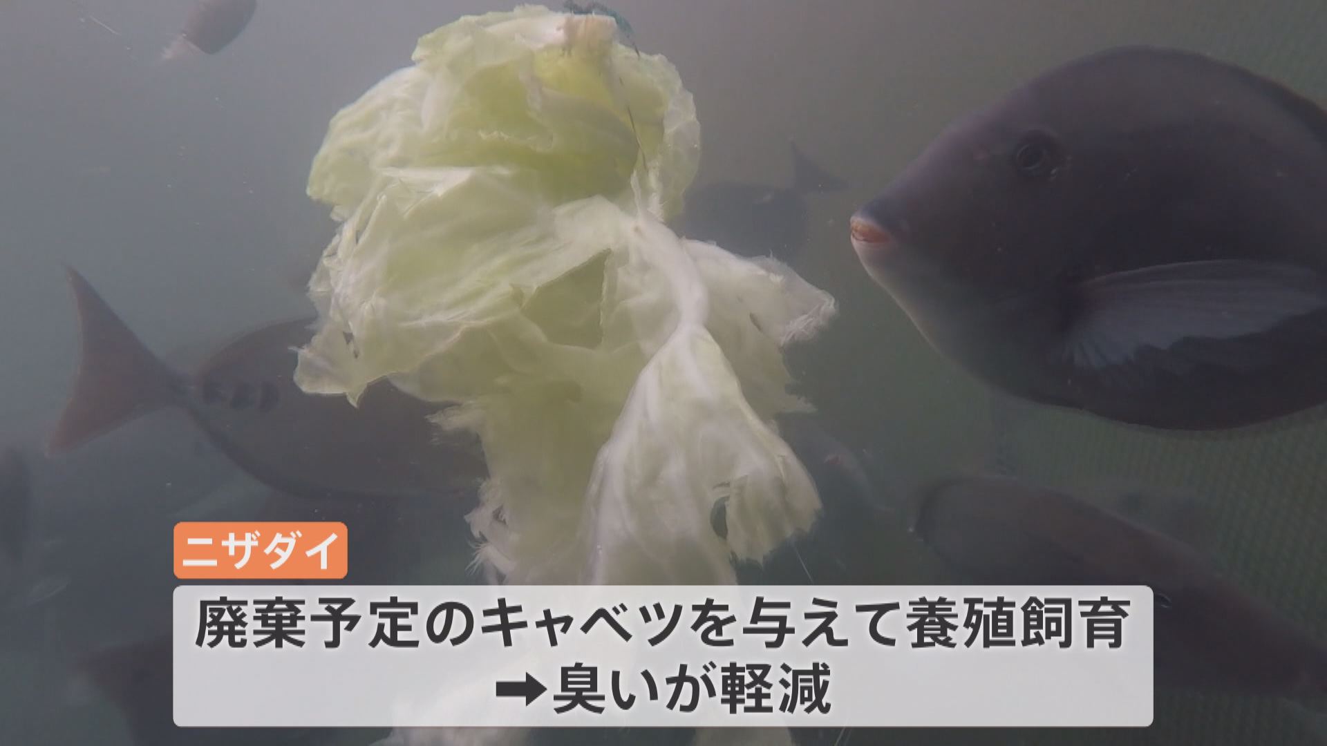 この「ニザダイ」、独特の臭いもあり、商品化しづらい魚なのですが、廃棄予定のキャベツを与えて養殖飼育したところ臭いも軽減。美味しく味わえるようになったのです。