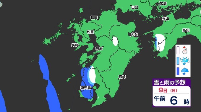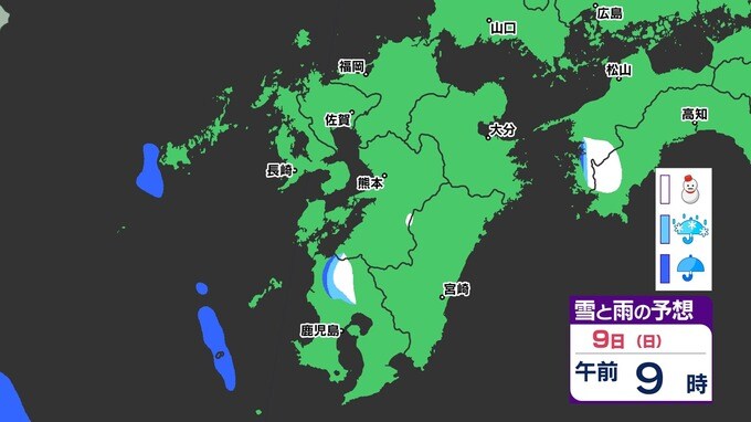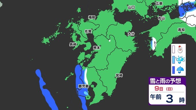 【大雪に関する気象情報】福岡・佐賀 脊振山は25cm超の雪か? 予想降雪量 大雪のおそれ【福岡・佐賀・長崎・大分・熊本・宮崎・鹿児島】雪のシミュレーション 南日本放送 2025年2月4日(火) 12:10 国内 天気 『白』=『雪』/『水色』=『みぞれ(雨と雪が混ざったもの)』/『青』=『雨』の予想