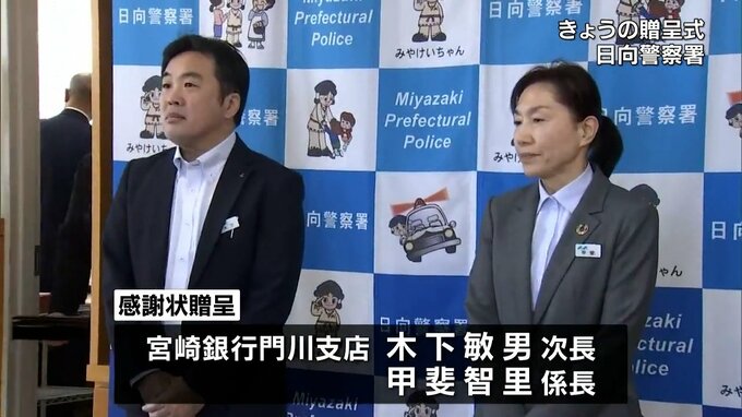SNS型ロマンス詐欺の被害を未然に防いだとして、宮崎県門川町の銀行の行員らに警察から感謝状が贈られました。日向警察署から感謝状が贈られたのは、宮崎銀行門川支店に勤務する次長の木下敏男さんと係長の甲斐智…