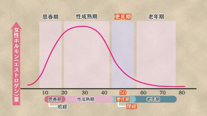 「更年期」とは、おおむね45歳から55歳の閉経前後の10年間を指します。症状の程度は人によって様々ですが、女性ホルモンが急激に減少することで心身に様々な不調が現れます。
