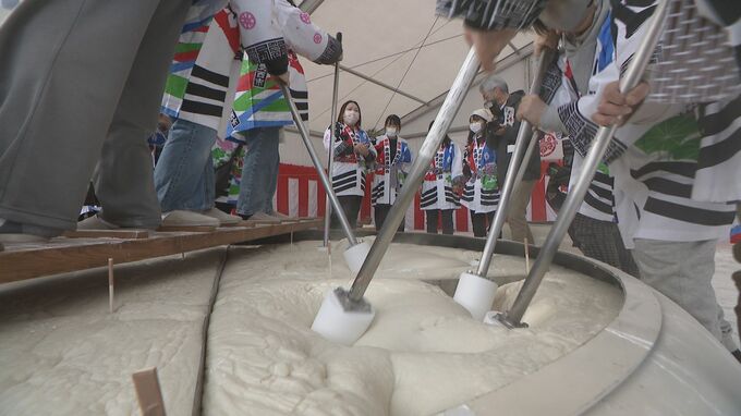 愛西市の皆さんの威勢の良いかけ声に合わせ、力強く杵(きね)を振り下ろしていました。