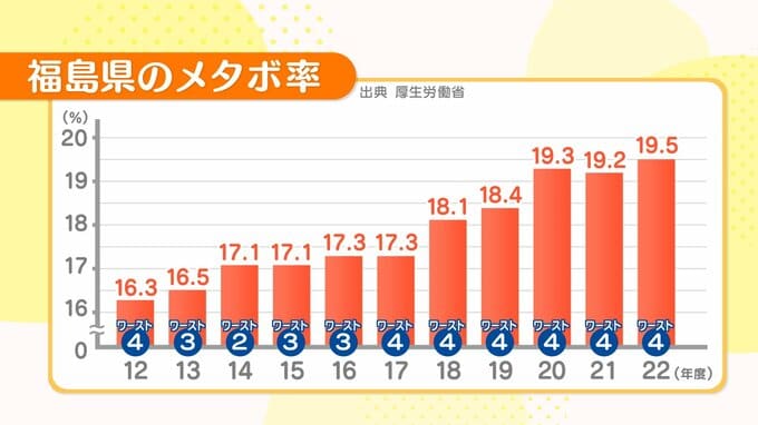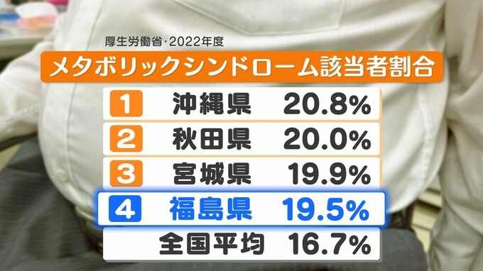 特定健診でメタボリック・シンドロームに該当した人の割合が高い順で並べた都道府県別のランキングです。最新の調査で、福島県はワースト4位の19.5%と、全国平均を2.8%も上回っています。
