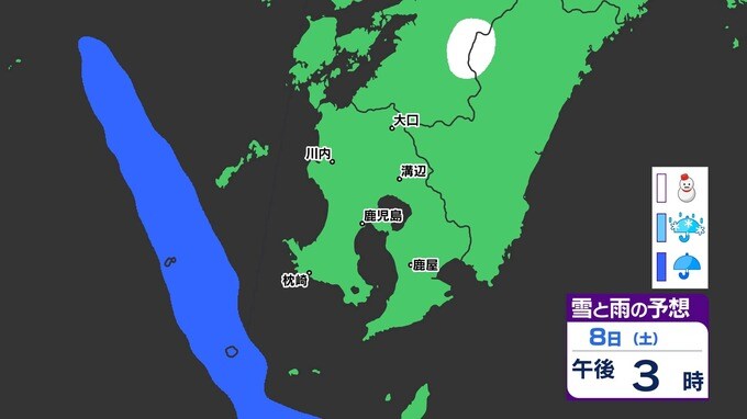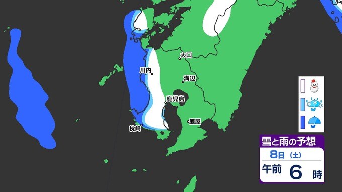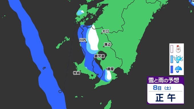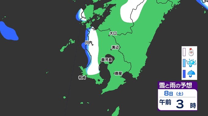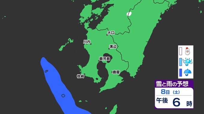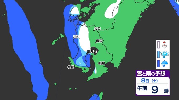 【鹿児島 大雪情報】あす朝積雪のおそれ 【薩摩地方 山地20cm 平地10cmの雪(多い所)】雪のシミュレーション 南日本放送 2025年2月4日(火) 18:45 国内 天気 『白』=『雪』/『水色』=『みぞれ(雨と雪が混ざったもの)』/『青』=『雨』の予想