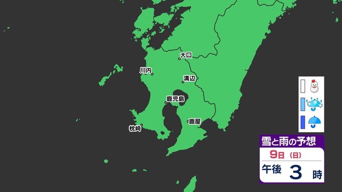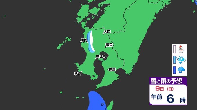 【鹿児島 大雪情報】あす朝積雪のおそれ 【薩摩地方 山地20cm 平地10cmの雪(多い所)】雪のシミュレーション 南日本放送 2025年2月4日(火) 18:45 国内 天気 『白』=『雪』/『水色』=『みぞれ(雨と雪が混ざったもの)』/『青』=『雨』の予想