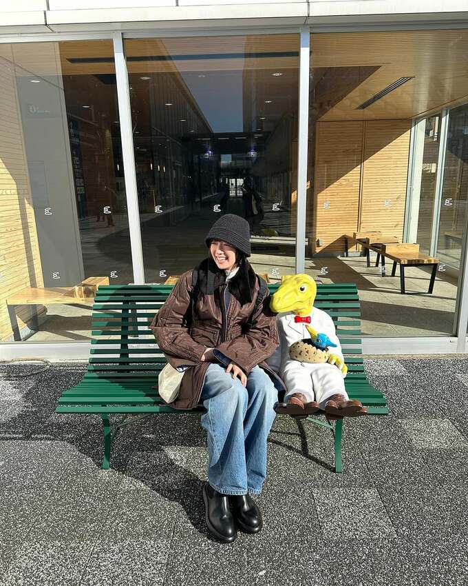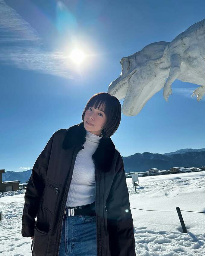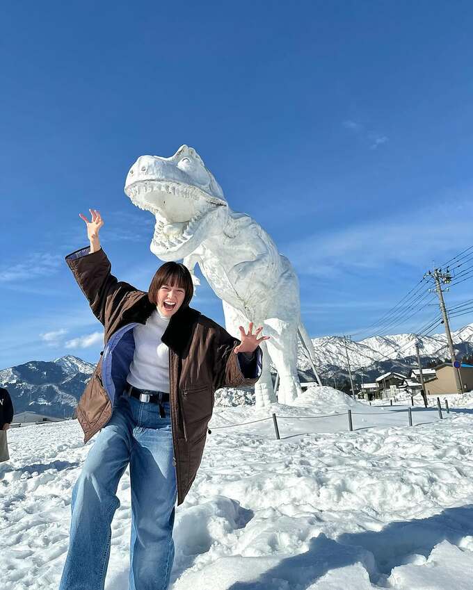 佐藤栞里さんは「念願の越前ガニを食べて、あまりの美味しさにとんでもなく感動して」と書き出すと、「青空と雪のコントラストに嬉しくなって、デニムも靴もびしょびしょにして」「夢にまでみた恐竜博物館で、大興奮のあまり、りゅうのすけ君の恐竜数え歌が頭から離れなくなって」「夜には推しの歌声をからだと心にたぷたぷ沁み込ませて。」と、『福井旅』の楽しかった思い出をひと綴りにし、満喫ぶりを表現した14枚の写真も紹介しました。