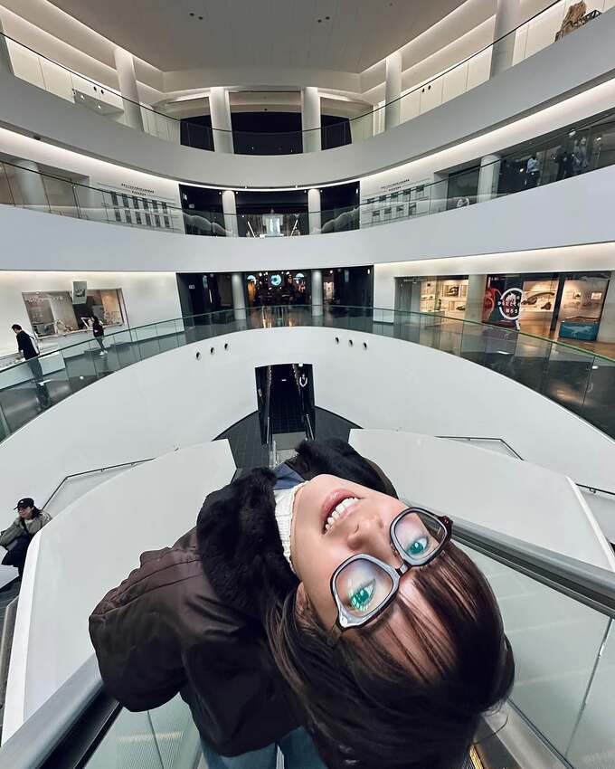 地上3階から地下1階までつながる、全長33mのエスカレーターの上で笑顔を見せる栞里さん。