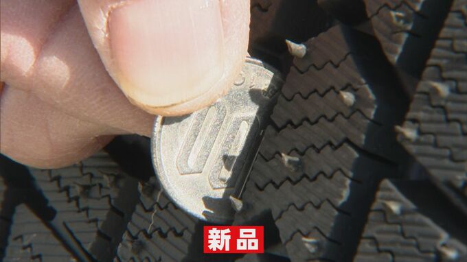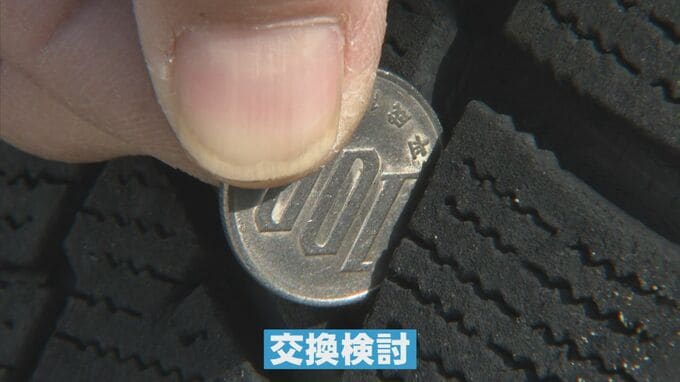 「100円玉を持っていただいて、タイヤの溝の中に当てていただきます。そうすると、すり減ったタイヤであれば1の数字が見えてしまうんですけど、新しいタイヤは1の数字が隠れますので、1の数字が見えたらそろそろ交換を検討されたほうが良いと思います。」