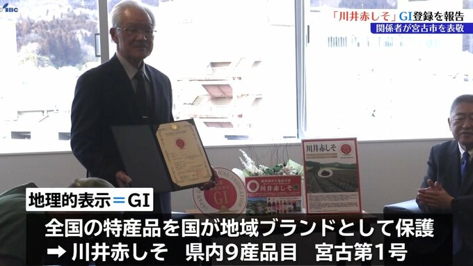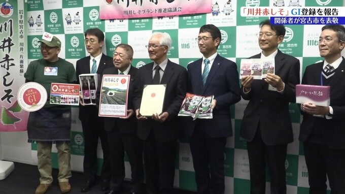 岩手県宮古市川井で生産されている「川井赤しそ」が1月、全国の特産品を国が地域ブランドとして保護する地理的表示=GI登録を受け、宮古市役所で関係者の報告が行われました。